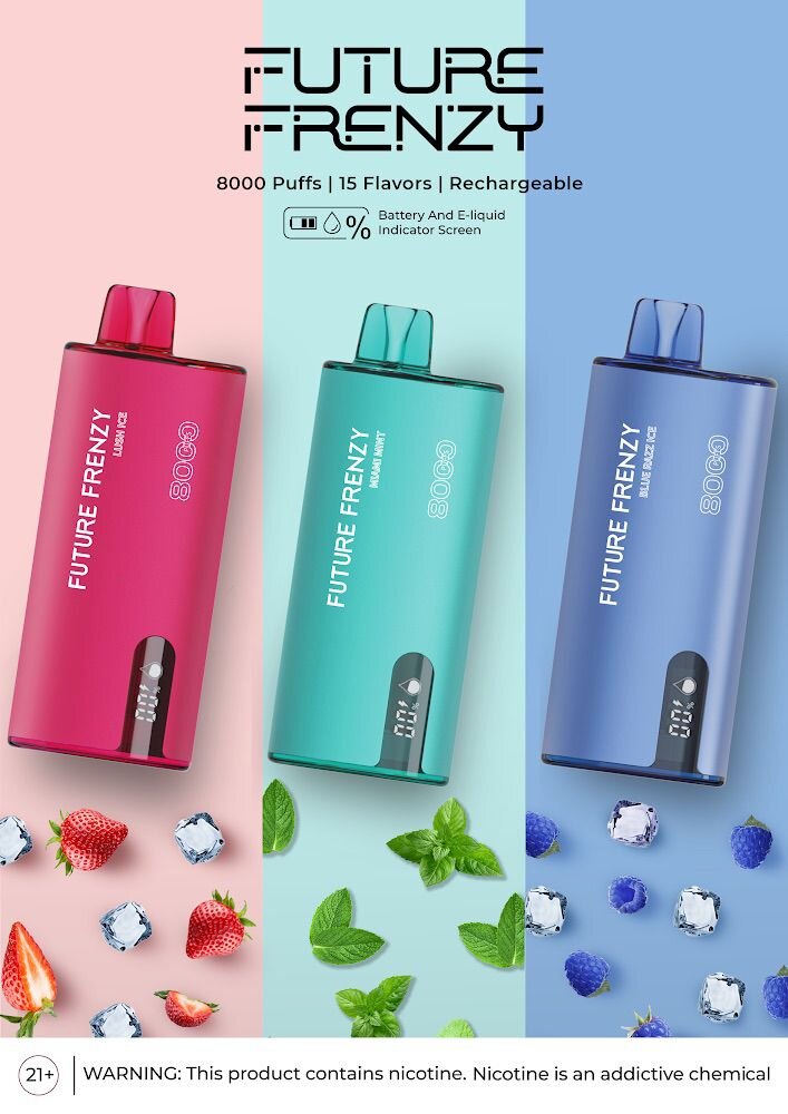 Overall, the Future Frenzy 8000 Puffs combines practicality with an array of flavorful choices in a sleek, modern design. It’s perfect for both new and seasoned vapers looking for a user-friendly option that doesn’t compromise on quality or taste. Enjoy the future of vaping with Future Frenzy.